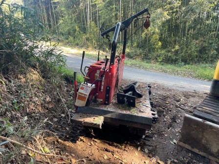 エンジンはかかるものの、操作不能なため、バックホウ(4トン)で道路脇まで動かすことができました。